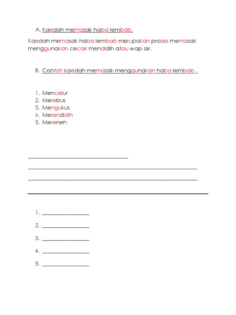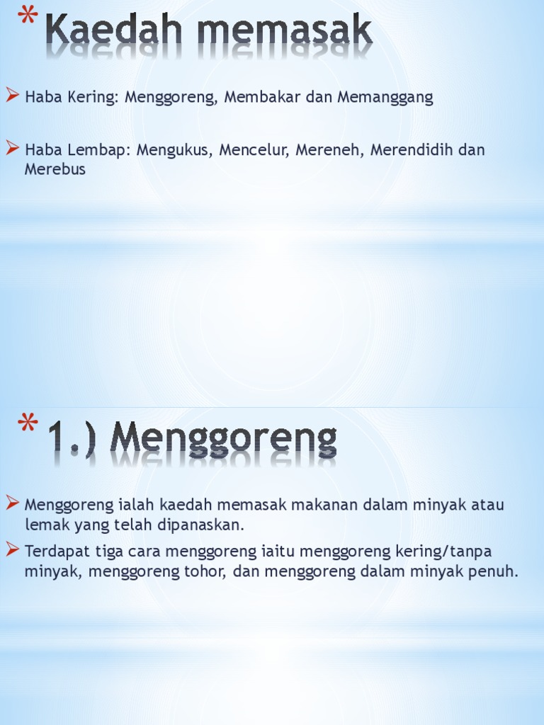 You can do the exercises online or download the worksheet as pdf. Kaedah memasakkaedah memasakprinsip memasak adalah penyediaan makanan dengan menggunakan kaedah memasak yang sesuai. Membakar merupakan kaedah memasak makanan yang menggunakan haba kering berlarutan melalui perolakan daripada sinaran terma, biasanya di dalam ketuhar, tetapi juga dalam abu panas atau di atas batu panas. Terdapat 3 kaedah memasak, iaitu: Ini memendekkan masa memasak dan membolehkan daging menjadi seared baik di luar tetapi jarang di dalam.
